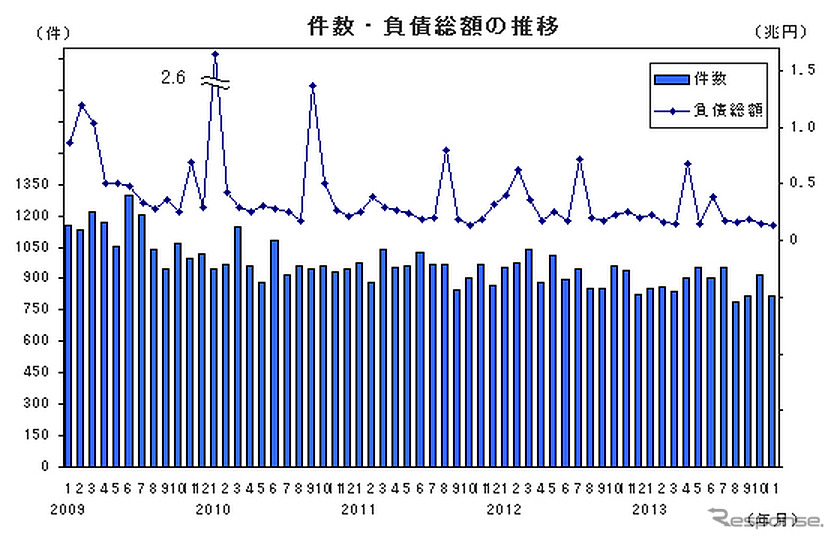 負債総額は、1335億1700万円(前月1524億900万円、前年同月2495億400万円)で、前月比は12.4%、前年同月比も46.5%の減少となり、2か月連続で前年同月を下回った。大型倒産の沈静化が続き、負債総額は今年最小を記録した。