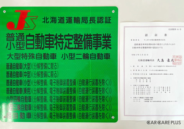 2020年5月22日、サッポロ日昭自動車は、北海道第一号として、国土交通省北海道運輸局より「特定整備」認証を取得。特定整備認証は、2020年4月に施行された自動車整備に関する新しい法律の一部で規定された認証で、自動ブレーキなどを備える車両(ASV)の安全性を確保するための重要な制度であり、将来的にはこの認証を持っていなければ国の定める特定整備に関する作業を行うことが出来なくなる。