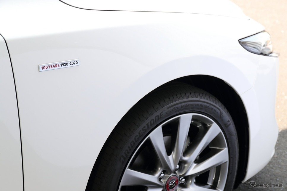 100周年特別記念車のベース車は、ボーズサウンドシステムや360°セーフティパッケージなどが別途追加された2.0リットルガソリンエンジン搭載の「20S L Package」の他、1.8リットルディーゼルエンジン搭載の「XD L Package」、SKYACTIV-X搭載の「X L Package」の3種類。ハッチバックタイプの場合、先進安全装備や運転支援機能、加飾などが別途追加された1.5リットルガソリンエンジン搭載の「15S Touring」が選択肢に加わる。駆動方式はそれそれに2WD(FF)と4WDが設定されている。