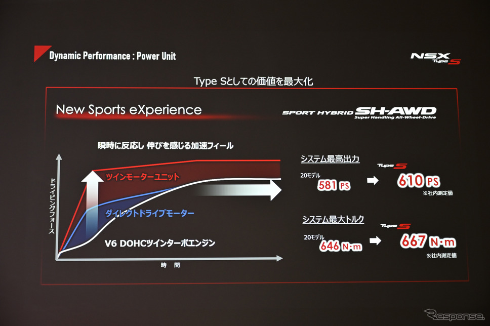 それくらい注目度の高いNSX タイプS。より精悍なフロント、空力面がかなり改善されたリアまわりで、ベースである現行の2代目NSXと印象も大きく変わってみえる。またタイプSはプレミアムスポーツに寄せたといいつつも、スポーツハイブリッドSH-AWDによる総出力は610psとパフォーマンスにもこだわりを見せる。