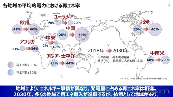 現状と2030年ということで、各地域の2018年断面の再エネ率、今予想される2030年の再エネ率を円で示してあります。南米、欧州のように2018年断面ですでに再エネ率が比較的高めの地域がある一方、現状ではこの青い丸にあるように、再エネ率が30%を切ってしまっています。将来的に30%を超えたとしても、2030年までに100%には到達しないでしょう。このエネルギー前提の中で、移動に関わるモビリティのエネルギーを我々はどう提供させていただくべきか考えなくてはいけません。それが、ライフサイクル全体を通してのカーボンニュートラルに影響してくる話になります。そういう意味で、こういう見方をしているとご認識いただければと思います。