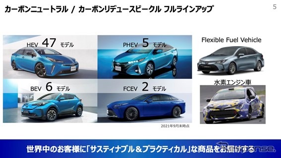 トヨタは電動車もフルラインナップと言っていますが、電動車になる前からトヨタにはフルラインナップになる下地があったとご理解いただければと思います。ハイブリッド車から参入し、たとえばブラジル向けのFFV(※ガソリンのほかエタノールなどのアルコールを燃料として走行できるフレックス燃料車)もすでに実用化しております。また、水素エンジン車のトライアルも実際にやっております。世界中のお客さまに対して均等にビジネスをさせていただいている背景もあり、こういう現状になっているわけです。