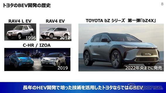 みなさんご存じのように、トヨタは2021年12月14日にバッテリーEVに特化したショーを実施いたしました。専用プラットフォームをベースに「bZシリーズ」というラインを新たに立ち上げ、トヨタの強みである安全、安心、実用性能、特に実用電費といった部分を大事にしながら、お客さまに安心して乗っていただけるクルマを展開して参ります。