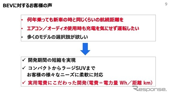 もう少し詳細に説明をさせていただきます。近代においてBEVを開発するにあたり、トヨタのお客さまを中心にBEVに対するお声を拾わせていただきました。そこでいただいたのが、「何年乗っても新車の時と同じくらいの航続距離を」「エアコン/オーディオを使っている時もあまり充電量を気にせずに運転したい」「多くのモデルの選択肢が欲しい」というものです。