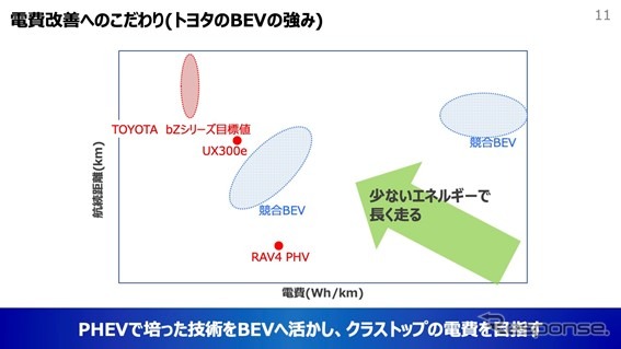 こちらの図の横軸は電費、縦軸は航続距離を示しております。一般的には、左上に行くほどお客さまにとって使い勝手のいい乗り物と解釈されるかと思います。絶対値はなかなか申し上げられないのですが、今回の「bZシリーズ」はイメージ的にはこの辺りのゾーンをターゲットに開発を進め、「bZ4X」もその最終段階を迎えつつあるとご理解ください。