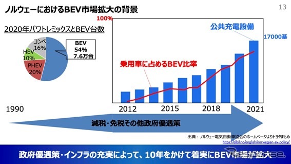 ノルウェーのバッテリーEVの普及率が50%超まで伸びている背景には、買う時も使う時も安く、お客さまにとって非常に利便性が高いことがあるのです。逆に言うと、これぐらいのことをやらないとBEVを普及させるのは難しいと我々は認識した方がいいかもしれません。BEVを今後やっていく上で、ノルウェーは要注目のマーケットだと思います。