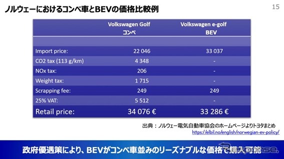 「Volkswagen Golf」を例にコンベ車とBEVの購入価格を調べると、現在のノルウェーの施策ではバッテリーEVの方が安く買えることがわかります。具体的にはコンべ車が3万4000ユーロであるのに対し、BEVは3万3000ユーロです。実際の使用時についても、オスロ郊外から市街地に乗り入れて2時間駐車して帰る場合、BEV以外では約30ユーロかかるのに対してBEVは6ユーロで済みます。