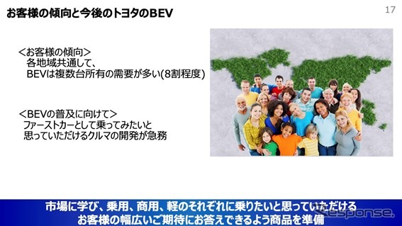 グローバルでよく見ていくと、BEVは複数所有のお客様が8~9割いらっしゃることがわかります。バッテリーEVを普及させるには、ファーストカーとして乗ってみたいと思っていただけるところまで実用性を高められるか、そういう商品を開発できるかどうかが今後ポイントになってくるのではないかと考えております。