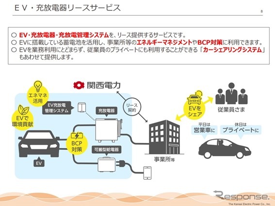 当社の事例としては、まず、法人の社有車や自治体の公用車等に対して、EVと充電器をセットでリースするサービスを提供しています。また、シェアリングサービスもオプションでご用意しており、平日はEVを社有車等として使用しながら、休日には社員の間でシェアをすることができます。それに加えてBCP*の一環としてEVから建物に電気を供給することができるパッケージをサービスとして提供しています。