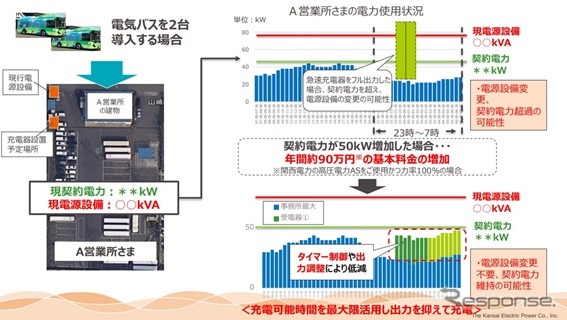また、営業所の既存の電力負荷に急速充電器の負荷が積み上がってしまうため、容量を超過する場合は電源設備をリニューアルしなければならず、大きなイニシャルコストになります。電源設備のイニシャルコストを抑制する観点からも充電のための電力供給を最適化する必要があります。関西電力はこの電力供給を最適化するためのエネルギーマネジメントシステムを充電器と一緒に販売し、EVバス導入にかかる費用の低減をご提案しています