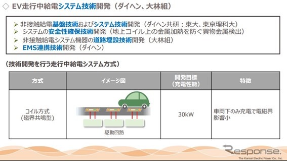 開発には2つの観点があり、ひとつは走行中の非接触給電です。道路にコイルを埋設し、自動車に搭載したコイルとの間で無線充電するものです。
