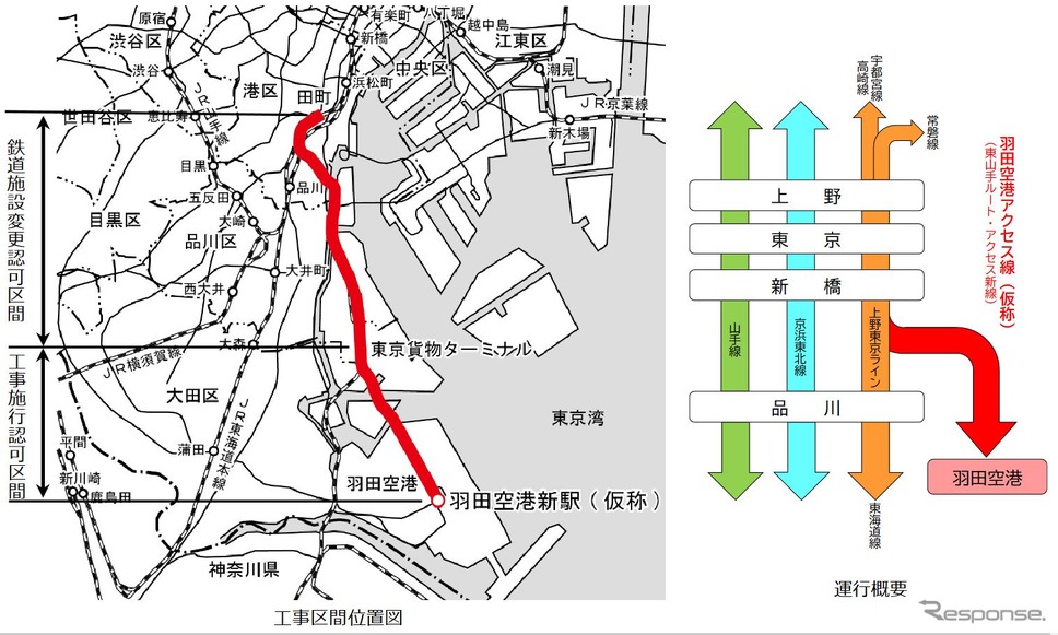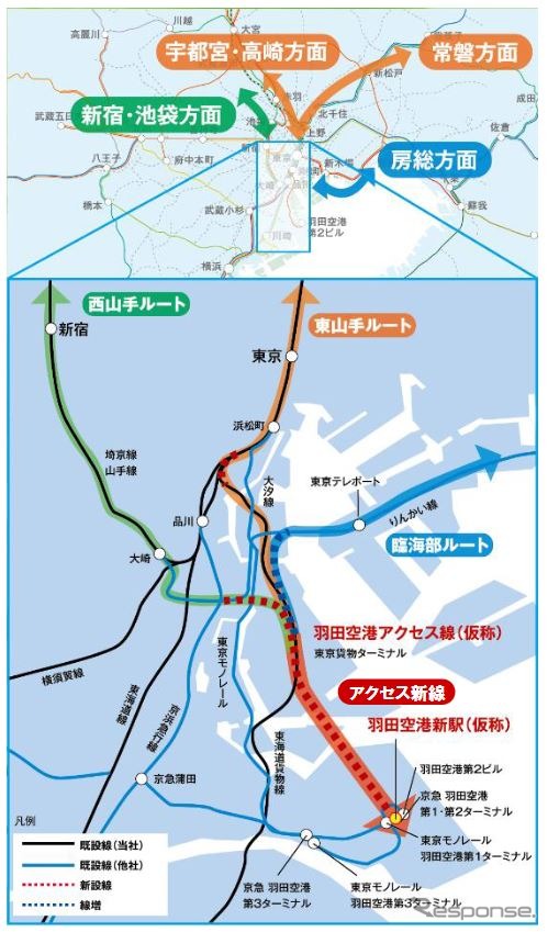 計画では、山手線の西側(新宿駅方面)から乗り入れる「西山手ルート」、山手線の東側(東京駅方面)から乗り入れる「東山手ルート」、東京臨海高速鉄道りんかい線(新木場駅方面)から乗り入れる「臨海部ルート」の3ルートがあり、2021年1月には各ルートが合流し、羽田空港新駅へ至る「アクセス新線」と呼ばれる新規建設区間約5kmの第1種鉄道事業が許可されている。