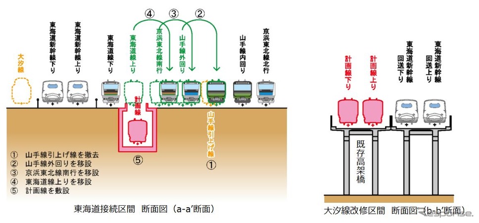 • 東海道線接続区間(左)と大汐線改修区間(右)の整備概要。東海道線接続区間の建設に際しては、東海道線の上下間にスペースを生み出すため、東海道線上り、京浜東北線南行、山手線外回りが順次移設され、田町駅の東京方にある山手線の引上げ線が撤去される。大汐線改修区間(右)では既存の橋梁や高架橋が活用される。