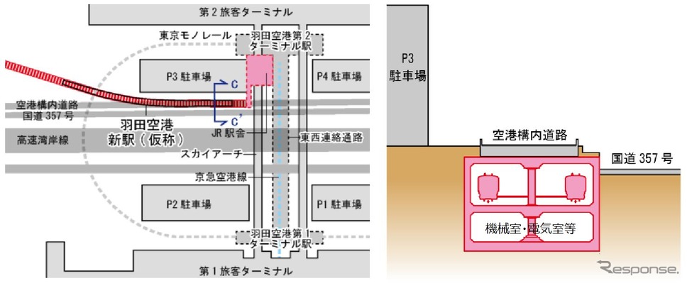 • 羽田空港新駅の位置図(左)と断面図(右)。最大幅員約12m、延長約310mの地下駅で、地下1階となる構内は1面2線の島式ホームを持つ。第2旅客ターミナルへフラットに移動することができるという。