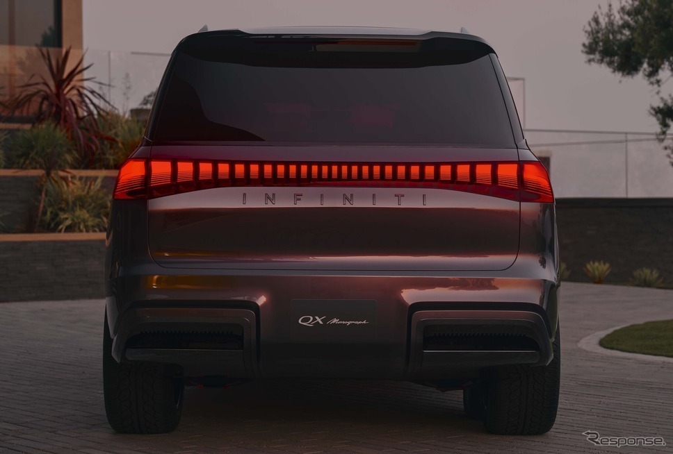 QXモノグラフのテールランプは、ボディの横幅いっぱいに配置された。スモーク仕上げのテールランプは、鮮やかな赤色で点灯する。テールライトの上側は強調されており、下側には6本のライトバーが水平に連なっている。この組み合わせが、印象的なシグネチャーを生み出すと同時に、光が水面で揺らめく様子を再現しているという。