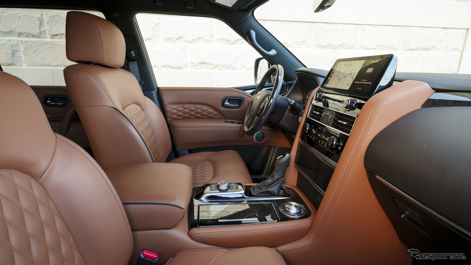 ナビリンクを備えた最新の「プロパイロットアシスト」を用意した。QX80は、ナビゲーションシステムから分析されたデータによって、カーブに進入する前や高速道路の出口の手前で、自動的に減速を行う。アマゾン「Amazon」の音声アシスト「アレクサ(Alexa)」を車載化した。音声コマンドだけで、音楽の再生、電話の発信、スマートホームデバイスの操作などを行うことができる。ステアリングホイールには、車線逸脱警告システム用のハプティック(触覚)テクノロジーを導入している。