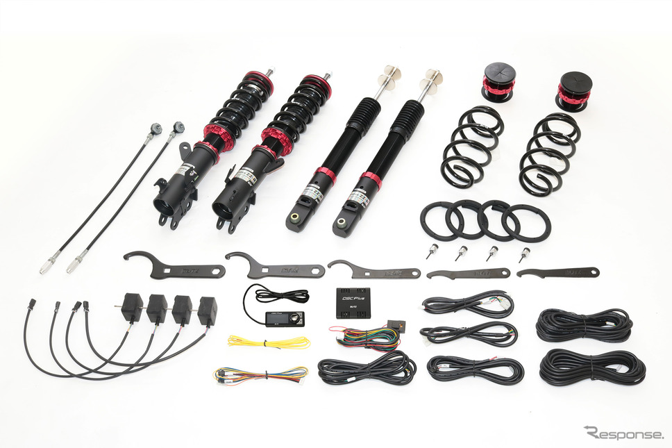 DAMPER ZZ-R SpecDSC Plusは車室内からの減衰力調整を可能にした、前述の全長調整式サスペンション「DAMPER ZZ-R」と電子制御式の減衰力調整を組み合わせた車高調キット。コントローラーには2.5インチVA液晶ディスプレイを採用し、4輪の減衰力を常時表示する。業界初の「フルオート」モードを搭載し、乗車人数や走行状態から適切な減衰力で姿勢を安定させる全自動コントロール機能を実現している。Gセンサーを標準搭載し、マップ制御モードでは旋回G・加減速G・車速から細かな減衰力調整が可能。