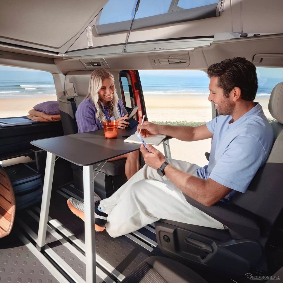 「カリフォルニア ビーチツアー」は回転・高さ調整可能な運転席と助手席、キャンプ用チェア2脚、キャンプテーブル、ポップアップルーフ内照明などを標準装備する5人乗りモデルだ。