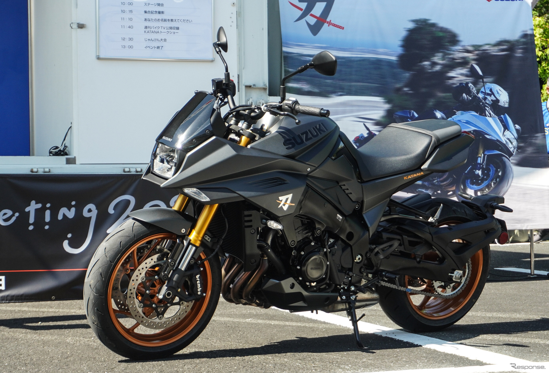 スズキは9月7日、人気ロードスポーツの『カタナ(KATANA)』オーナーやファンに向けた恒例のユーザー参加型イベント「カタナミーティング2025(KATANA Meeting 2025)」を開催。スズキの二輪事業を統括する伊勢敬本部長が、市販化されていない「黒い新型カタナ」で会場入りすると、思わぬサプライズに会場からは喜びの声が上がった。