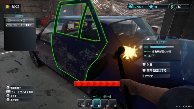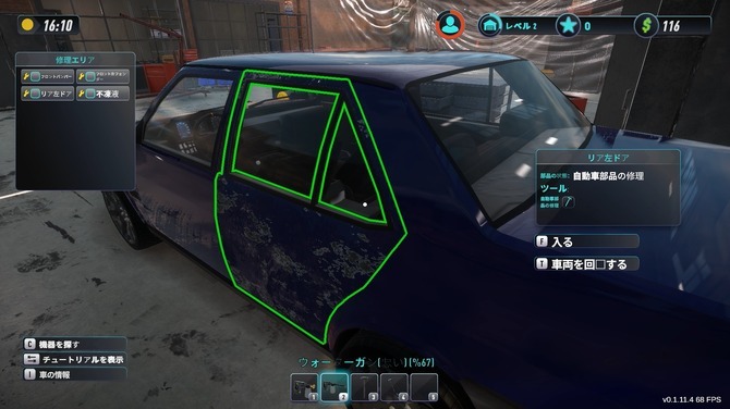 しばらく洗車の仕事をしていると、経験値が蓄積されてレベルアップ。ここから一番初歩的な修理スキルと作業場を開放し、ようやく本格的な仕事ができるようになります。