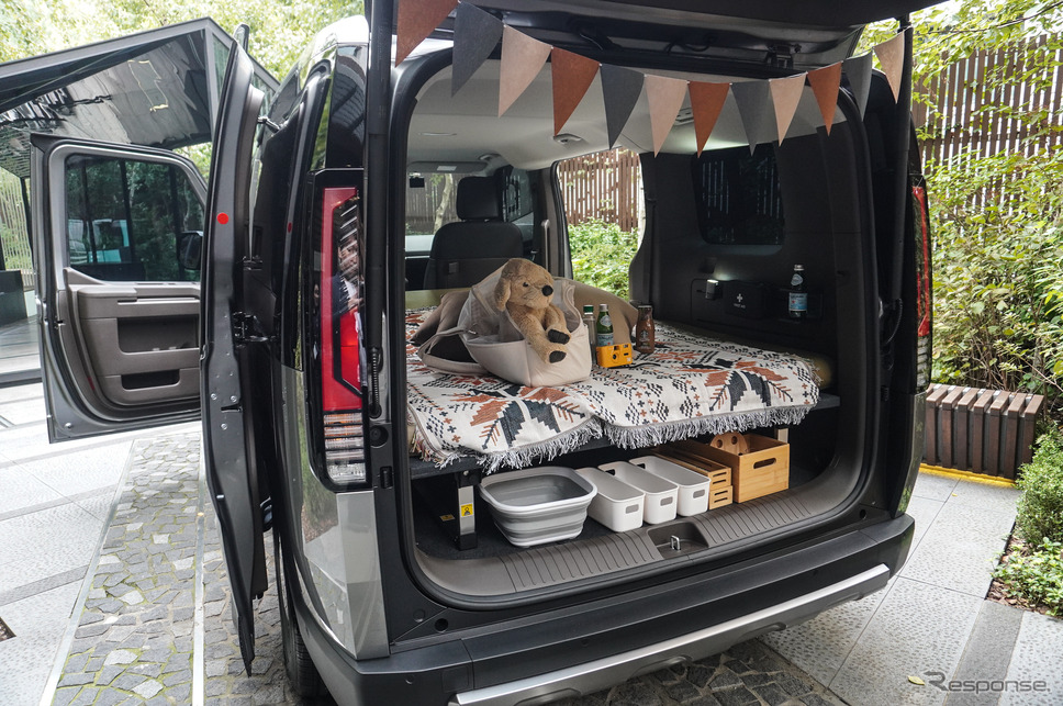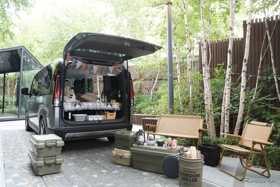 販売の主力は法人向けの貨物バン仕様としながらも、室内の広さを活かして昨今のアウトドア需要を見込み乗用バン仕様も販売する。V2H(Vehicle to Home)にも対応し、大容量のバッテリーに蓄えた電気で家庭の電力をまかなうことができるほか、キャンプなどで電化製品を使用することも可能だ。また、オプションで「アドギア」と呼ぶアクセサリーも多数用意。車内のダッシュボードや荷室の側壁に備わるレールを利用し、ワンタッチでスマホホルダーやドリンクホルダー、ライトや救急キットなどを取り付けることができる。「フルサイズで使えるEVキャンピングカー」という個性で、EVの新たな価値を提案する。