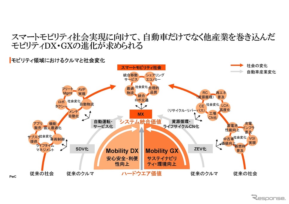 スマートモビリティ社会とは、単にIT化された移動手段のことではなく、デジタルによって新たな価値を生み出す「モビリティDX」と、環境対応を起因とした「モビリティGX」、この二つの潮流が合流した先に現れるものである。