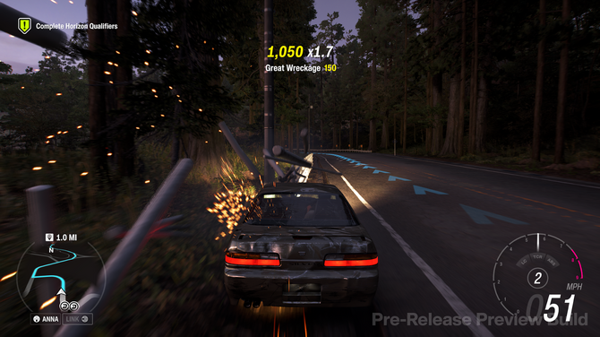 そんな『Forza Horizon』のゲーム性は至ってシンプル。雄大な自然と道路にあふれたマップ各所に、ミッションやレースが用意されています。該当地点まで車で走り、レースに勝ったりギミックをこなしたりすれば、報酬をもらったりランクが上がったりして、さらなるカスタマイズ要素やレース、ギミックが解放されていくというもの。