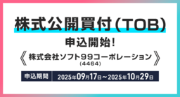 株式会社DMM.com証券(本社:東京都中央区、代表取締役 谷川龍二)が提供する株式オンライントレード【DMM 株】は、株式会社ソフト99コーポレーション(銘柄コード:4464)の株式公開買付(TOB)の復代理人として申込受付を開始いたしましたので、お知らせいたします。