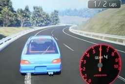 課外活動団体「コンピュータ部」が作成。コントローラーのハンドル、アクセル、ブレーキ、ギアを使って、いかに早くゴールできるかを競うレーシングシミュレーター。