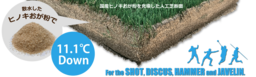 ※1:ヒノキおが粉を用いた人工芝と、ゴムチップの充填材を用いた人工芝(従来型人工芝)に同条件で各々散水を行い、従来型人工芝と比較してヒノキおが粉を用いた人工芝が、平均で11.1℃低温(表面温度)であることが確認された。