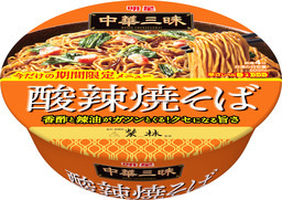 今回、東京・神楽坂にある高級中国料理の老舗 「榮林」 監修の下、酸辣湯の “すぱ辛” をダイレクトに味わえる創作メニュー 「酸辣焼そば」 を新発売します。「中華三昧」 酸辣湯麺シリーズ初の汁なしメニューとなっており、濃口醤油と中国醤油にチキン、チャーシュー、オイスターと香酢の旨みと酸味を効かせた醤油だれにごま油の風味、ラー油の辛み、黒酢の香りの効いたオイルを合わせました。また具材として、酸辣湯にふさわしいチンゲン菜、カニカマ、きくらげを入れました。