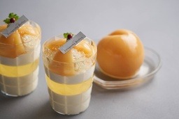 ヨーグルトのパンナコッタに、水熟桃のシロップと桃のリキュール「ピーチツリー」を合わせた香り高いジュレを重ね、シャンティクリームを絞りました。仕上げには、はちみつレモンのジュレと「水熟桃」の果肉を贅沢に重ねました。ヨーグルトやはちみつレモンのさわやかな酸味が、桃の甘みを引き立て、旬を過ぎてもまるで採れたてのようなフレッシュな味わいに仕上げました。