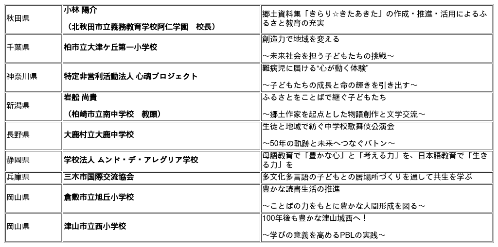 日本国内在住の6~15歳(特別支援教育は4~18歳)の子どもたちに対する「国語・日本語・ことばの育成に関わる教育実践」と、「特別な配慮や多様なニーズのある子どものコミュニケーション活動を支援する教育実践」を軸に、「国語教育」「日本語教育」「特別支援教育」「日本文化・ふるさと共創教育」「国際文化・多文化共生教育」「独創性と先駆性を兼ね備えた教育活動」の6領域に関連する活動を贈賞対象としています。