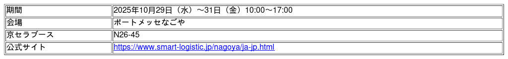 京セラ株式会社は、2025年10月29日(水)~31日(金)までポートメッセなごやで開催される「第5 回 [名古屋]スマート物流EXPO」に出展いたしますのでお知らせします。