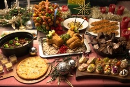 シェフが腕によりをかけた本格イタリアンがブッフェボードを華やかに彩ります。前菜には「マグロ・アボガド・トマトのクリスマスカラーのブルスケッタ」や「タイのカルパッチョ・クリスマス・リース仕立て」など、クリスマスをお祝いするメニューをご用意。メイン料理にはクリスマスの定番であるローストチキンに加え、トスカーナ地方の伝統料理「豚肉のアリスタ」やシチリア地方の甘酸っぱい味が特徴の「鴨ロース肉のアグロドルチェ」、ナポリ名物「漁師風ペスカトーレ」など、イタリア各地を代表する料理で華を添えます。デザートコーナーには、定番の「ブッシュ・ド・ノエル」やサンタクロースを飾った「クリスマス・ショートケーキ」、クリスマスツリーに見立てた「ミニタルト」など、パティシエ特製のスイーツが並び、最後まで贅沢な気分でお楽しみいただけます。