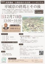 公益社団法人 奈良市観光協会(所在地:奈良市三条本町 会長:増尾 朗)は、世界遺産「古都奈良の文化財」が登録25年を迎えた2023年に始まったシンポジウムを今年も開催します。第3回となる今回は、『平城京の終焉とその後』をテーマに、考古学の権威・田邉 征夫氏(公益財団法人 元興寺文化財研究所所長)と六社寺の代表らが登壇します。