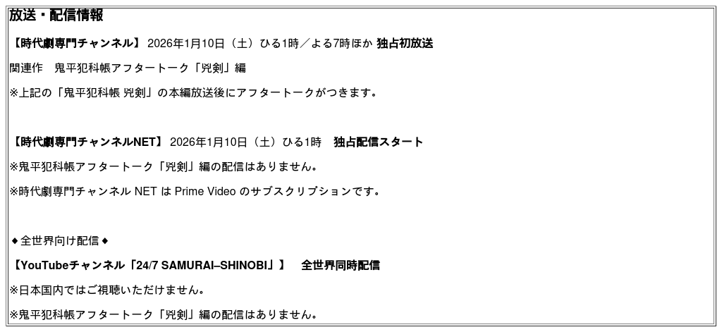 そしてこの度、最新第7弾「鬼平犯科帳 兇剣」の放送・配信が2026年1月10日(土)に決定。また、全世界同時配信も決定しました。