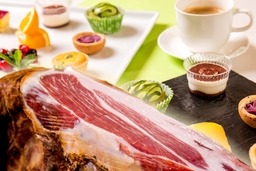 「田沢湖放牧豚」の原木からスライスして提供する生ハムと10種類以上のデザート
