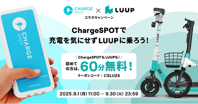 株式会社Luup(本社:東京都品川区、代表取締役CEO:岡井大輝、以下「Luup」)は、モバイルバッテリーのシェアリングサービス「ChargeSPOT(R)(チャージスポット)」を運営する株式会社INFORICH(本社:東京都渋谷区、代表取締役 Group CEO:秋山 広宣、以下「INFORICH」)と、コラボキャンペーンを9月1日(月)から9月30日(火)まで開催します。