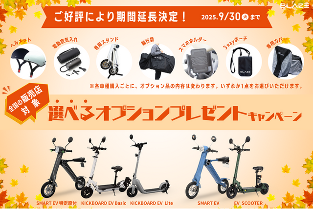 本キャンペーンは、全国の販売店にてブレイズの2輪電動モビリティをご購入いただいたお客様を対象に、便利で実用的なオプション品の中からお好きな1点をプレゼントするものです。