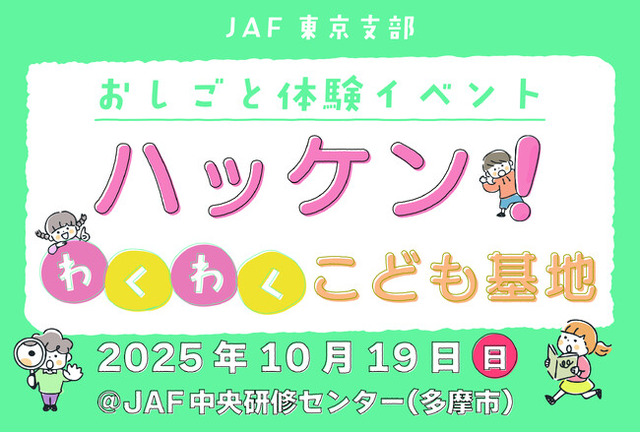 一般社団法人 日本自動車連盟(JAF)東京支部(支部長 加藤和夫)は、10月19日(日)にJAF中央研修センター(多摩市永山)で、小学生とその保護者を対象にした「おしごと体験イベント ハッケン!わくわくこども基地」を開催します。
