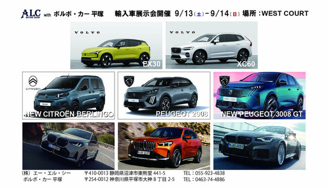 今回の展示会は、ネクステージとALCが初めて共同で出展するイベントとなり、ALCが取り扱うBMW・PEUGEOT・CITROENの人気車種に加え、ネクステージが運営する正規輸入車ディーラー『ボルボ・カー 平塚』からも2台の車両を展示します。