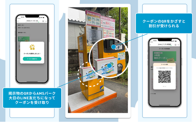 実証実験では、実証の場である「AMSパーク大日」(大阪府守口市大日東町11)の専用LINE公式アカウントに紐づくLINEミニアプリを開発し、割引クーポンの配信と、駐車場に関する情報提供をおこなっています。