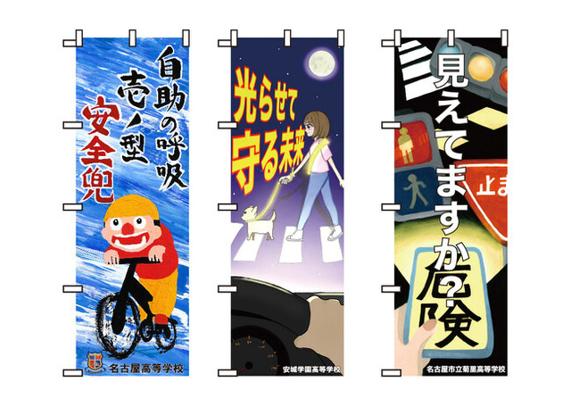 JAF(一般社団法人 日本自動車連盟)愛知支部(支部長 今枝 実)は、愛知県内の高等学校と一般財団法人 愛知県交通安全協会との産学官連携活動にて制作した、「交通安全啓発用のぼり旗」3作品を公開しました。
