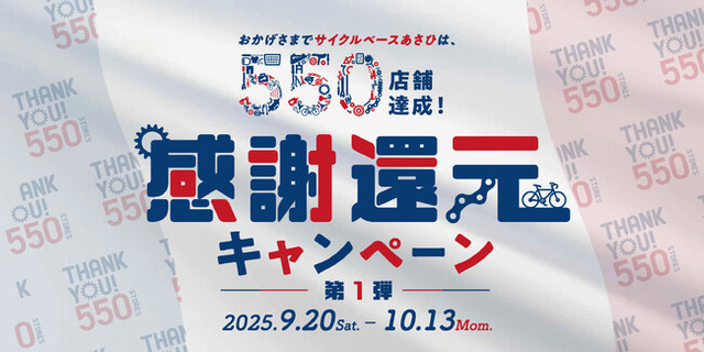 お客様に快適な自転車ライフを提供する株式会社あさひ(以下、あさひ/所在地:大阪市都島区、代表取締役社長:下田佳史)は、運営する店舗数が550店舗を達成したことを記念して、2025年9月20日(土)より「感謝還元キャンペーン」を全国のサイクルベースあさひで実施いたします。