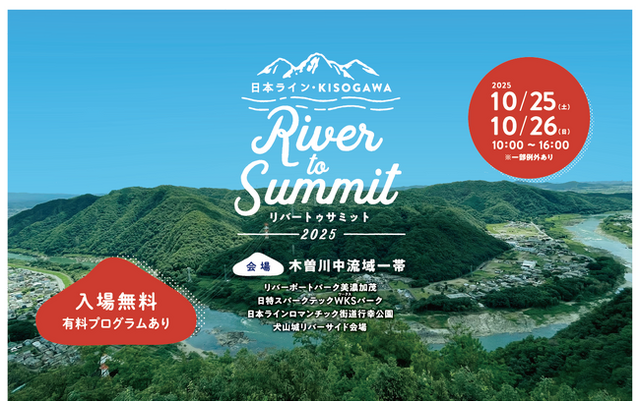 岐阜県を流れる木曽川の中流域において、流域の魅力を体感できる広域イベント「日本ライン・KISOGAWA River to Summit 2025」が、令和7年10月25日(土)、26日(日)に開催されます。本イベントは、流域5市町(美濃加茂市、各務原市、可児市、坂祝町、愛知県犬山市)の官民連携組織「木曽川中流域観光振興協議会」が主催し、今年で4回目の開催となります。会場では、木曽川の絶景を舞台にしたリバーアクティビティやウォーキングイベントをはじめ、地元食材やクラフト製品が並ぶマルシェ、音楽ステージなど、多彩なプログラムを通して流域の自然・食・歴史文化を満喫いただけます。