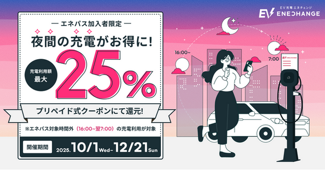 ミライズエネチェンジ株式会社(本社:東京都中央区、代表取締役社長:柘野 善隆)は、EVおよびPHEV向け定額充電プラン「エネチェンジパスポート」の加入者様を対象に、対象時間外(16:00~翌7:00)利用額の最大25%を充電クーポンで還元する「エネパス ナイトチャージキャンペーン」を2025年10月1日(水)から12月21日(日)まで実施いたします。