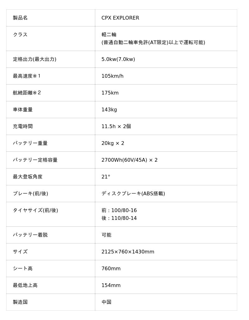 [表: https://prtimes.jp/data/corp/21330/table/107_1_683e22dd1d25efcf1616865d6cbff422.jpg?v=202510010519 ]※1 メーカー公表値。道路状況や上り坂、ライダーの体重や積載重量により異なります。