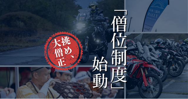 日本三霊山ラリーは、古来より信仰の対象であった霊山を巡る、精神的なテーマを持つ挑戦的なツーリングラリーです。ライダー一人ひとりラリー参加の記録を、誰の目にも明らかにし、モチベーションの向上と挑戦の継続を促すため、累積獲得ポイントに応じ、翌年のゼッケンカラーが変動する「僧位制度」を導入することといたしました。[画像2: https://prcdn.freetls.fastly.net/release_image/160440/34/160440-34-2f15aedf4ca02575ae92eafffd9882a9-706x496.jpg?width=536&quality=85%2C75&format=jpeg&auto=webp&fit=bounds&bg-color=fff ]