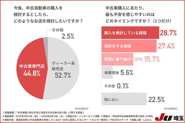 埼玉県中古自動車販売商工組合 JU埼玉(所在地:埼玉県さいたま市、会長・理事長:高橋 光晴)は、中古自動車を保有している20~50代の方を対象に、「中古車購入時の不安と保証付き中古車の安心感」に関する調査を行いました。